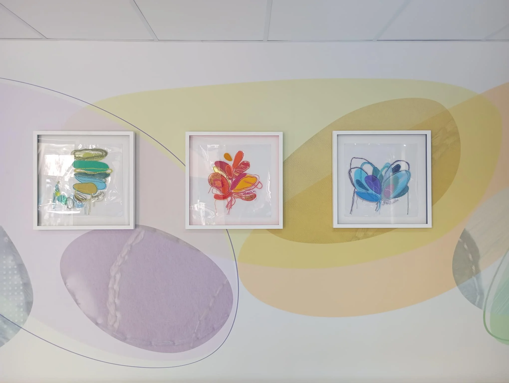‘Fragility’, ‘Crucial’, ‘Gratitude’ explore people’s feelings about the NHS. The mixed media works sit on a bespoke wall vinyl that I created to bring unexpected texture at scale to the walls of the hospital. Commissioned by University Hospitals Bristol & Weston. Installed at Weston General Hospital